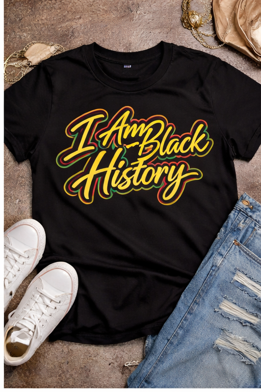 The I Am Black History Tee is a bold statement piece designed to honor culture, identity, and legacy. Featuring vibrant Pan-African inspired lettering on a classic black tee, this shirt is made to stand out while remaining timeless.